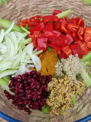 Bien mélanger le contenu du saladier tout en malaxant légèrement afin que le sel et les épices imprègnent bien les morceaux de légumes