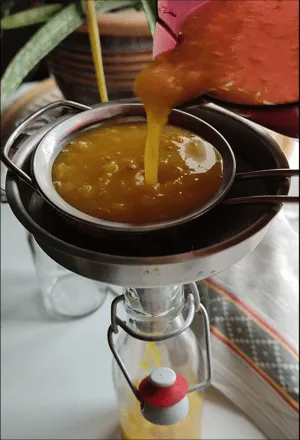 - Remuez le contenu du bocal pour bien homogénéiser la préparation. Mettez un entonnoir sur la bouteille à fermeture mécanique, une passoire à maille fine par dessus l’entonnoir puis y verser la préparation. On filtre ainsi afin de retirer les morceaux de gingembre. Pensez à bien écraser a pâte dans la passoire pour en extraire le jus.