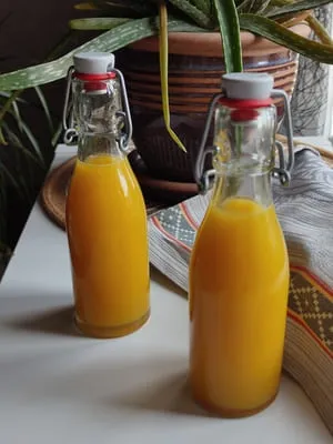 Et le goût alors me demanderiez-vous ? Il n’est pas en reste, J’ai rajouté du gingembre frais qui se marie très bien avec l’orange ! Ça n’est pas de l’orangina hein, je préfère vous prévenir ! Elle se boit très frais. La boisson n’est pas du tout sucrée, le sel ajouté pour la lacto n’est même pas perceptible et bien sûr le goût de l’orange et du gingembre frais sont présents. En tout cas moi j’adore, elle est très tonifiante !
