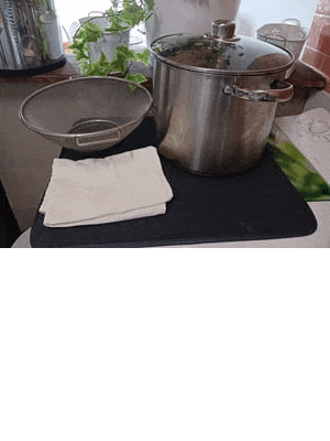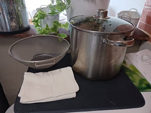 La cuisson du riz se fera à la vapeur. N’ayant pas de cuiseur vapeur, j’utilise un haut faitout sur lequel je dépose une grande passoire à maille fine recouverte d’étamine et je couvre le tout avec le couvercle du faitout.