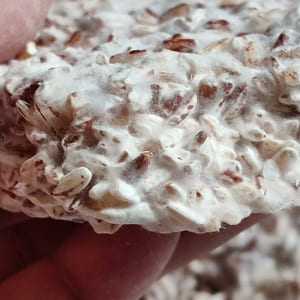 Voici comment ressemble le tout début du développement du mycélium. On voit apparaître par endroit uniquement des petits points bancs et à d’autres le duvet commence à être visible. A titre indicatif, j’ai obtenu ce résultat au bout de 32h.